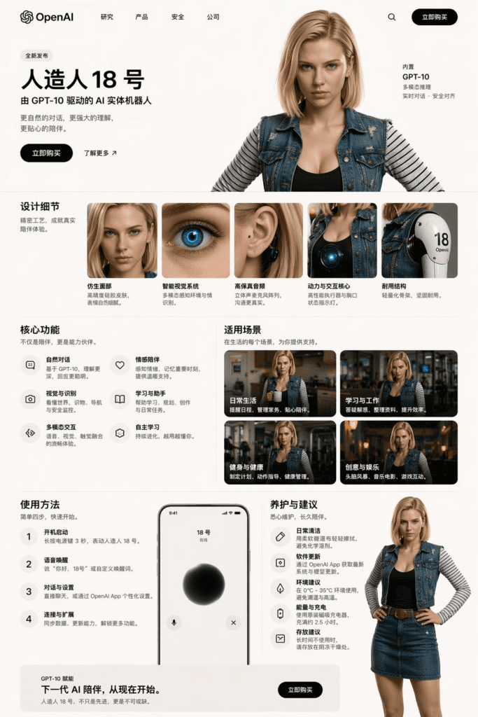 OpenAI推出的人造人18号AI实体机器人商品展示网页,网页于和当前的OpenAI设计风格一致,语言为简体中文,机器人内置最新版GPT 10大模型。